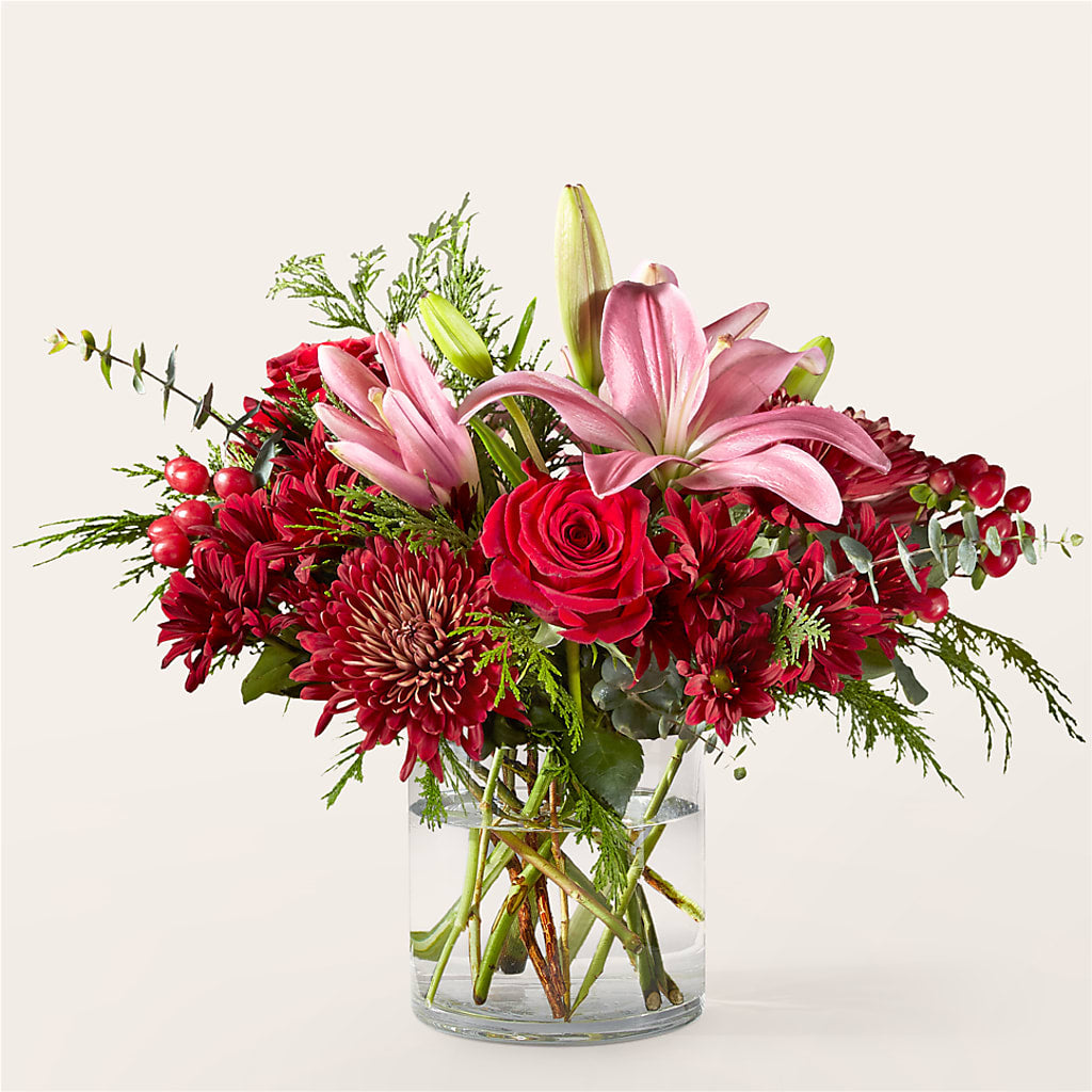 This gift arrives at their doorstep blooming with red mums, daisies, and pink lilies to make their day as sweet as your favorite Christmas cookies.
